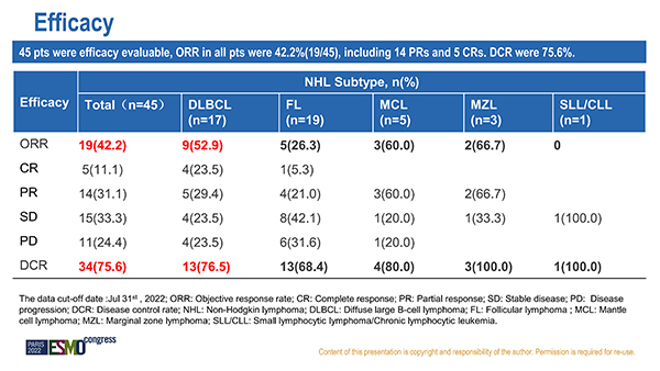 北京時(shí)間9月10日21點(diǎn)15分,中國(guó)醫(yī)學(xué)科學(xué)院腫瘤醫(yī)院石遠(yuǎn)凱教授在線進(jìn)行了精彩口頭會(huì)議報(bào)告(報(bào)告編號(hào)618O),報(bào)告標(biāo)題:《A phase 1 study of TRS005, an anti-CD20-MMAE antibody-drug conjugate, in relapsed or refractory B-cell non-Hodgkin lymphoma》。報(bào)告公布了TRS005最新I期臨床研究數(shù)據(jù),數(shù)據(jù)顯示,既往接受過(guò)2線及以上的非霍奇金淋巴瘤患者中,TRS005展現(xiàn)了良好的療效及可控的安全性。